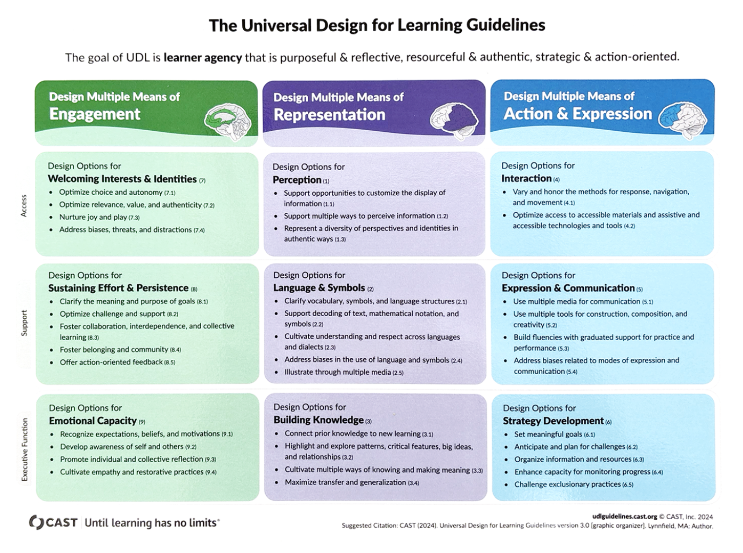 We rely on the Universal Design for Learning Guidelines to helps us build frameworks for our solutions. We respect that these guidelines encompass the ‘whole brain’ approach and affirms that we all do not learn and retain knowledge the same way.