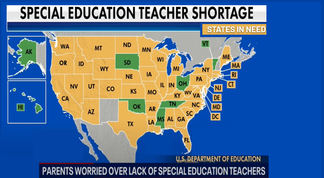 The majority of US states in yellow are in great need for support for their kids but yet there is a huge shortage of special ed teachers due to burnout, heavy workloads and now non-existent budgets. Many special education teachers report: